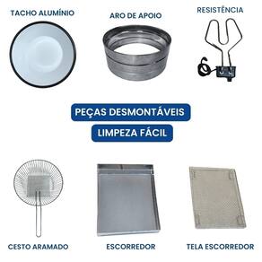 Tacho esmaltado com capacidade de 7 litros, ideal para uso comercial e residencial. Termostato ajustável de 50°C a 300°C. Inclui escorredor grande para frituras sequinhas e cesto aramado.Porta-fio