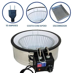 Tacho esmaltado com 5 litros de capacidade total e escorredor médio. Termostato regulável de 50°C a 300°C. Cabos e alça em Inox. Uso comercial e residencial.Porta-fio