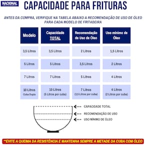 - Capacidade de óleo: de 2,5L até 4L (sobrando espaço para os alimentos e resistência)