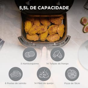 Capacidade Widemax 5,5L: Ideal para preparar refeições completas para toda a família, otimizando seu tempo na cozinha.
