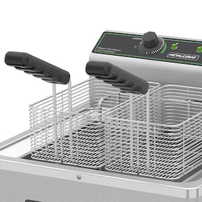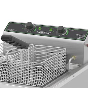 Fritador Elétrico de Mesa fabricado externamente em aço inox escovado 430 e tanque em aço inox 304. Seu painel é removível com resistências blindadas em inox que contam com proteção e bulbo do termostato em aço inox. Essa Fritadeira acompanha termostato para controle de temperatura e segurança, lâmpada piloto que indica o funcionamento da resistência e válvula esfera de escoamento do óleo.