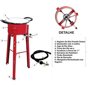 Informações Técnicas Marca: Indústria ROA Material: Chapa de Ferro com Pintura Eletrostática na cor Vinho Dimensões do Pasteleiro: Altura Total 76cm x Diâmetro da Boca 26cm Dimensões do Queimador: Comprimento Total 280m x Diâmetro 90mm com 04 Caulins bicos espalhadores de chama Pés de Alta Resistência removíveis com Pintura Eletrostática Registro Zamac com Injetor 0,40mm Peso: 3,7kg