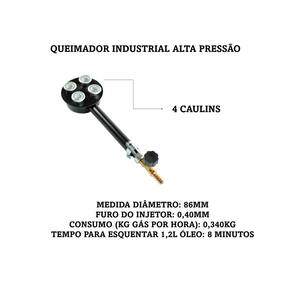 Possui queimador de alta pressão, acompanha Tacho nº12. Utiliza gás de botijão. Serve para frituras em geral industrial.