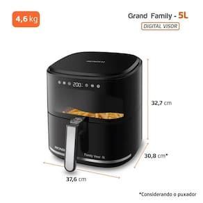 A Air Fryer Grand Family Digital Visor Mondial une praticidade e inovação em um único aparelho. Seu visor frontal e iluminação interna permitem acompanhar todas as etapas do preparo com a cuba fechada. Ela possui um painel digital touch que oferece controle preciso de tempo e temperatura, além de um design moderno e elegante. Com capacidade de 5 litros, acomoda os alimentos perfeitamente e garante a distribuição uniforme do ar quente. A potência de 2.000W proporciona eficiência e agilidade na cozinha. Descubra todas as funcionalidades da AF-50-DV da Mondial: