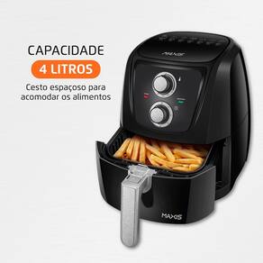 Fritadeira elétrica sem óleo Mondial Maxis AF-01-MX com capacidade de 4 litros, controle de temperatura até 200°C, timer de 60 minutos, cesto antiaderente removível, lâmpadas piloto e desligamento automático.Porta-fio