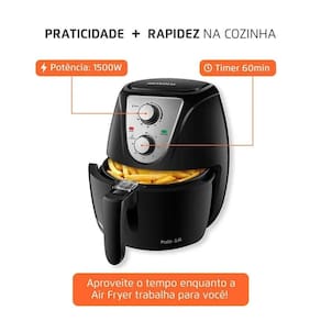 Acrescente praticidade e saúde à sua rotina diária com a Air Fryer Mondial AF-36-BI. A Tecnologia de Circulação de Ar Quente cozinha, frita (a ar), assa e tosta os alimentos sem precisar adicionar óleo ou . Além disso, a alta potência proporciona rapidez no preparo das receitas. A Air Fryer possui capacidade de 3,6 litros e o cesto é revestido com antiaderente Duraflon, tecnologia exclusiva Mondial. Saiba mais sobre a AF-36-BI: PRATICIDADE + RAPIDEZ NA COZINHA: A Tecnologia de Circulação de Ar Quente e a alta potência possibilitam rapidez no preparo das receitas e praticidade em sua rotina na cozinha. CAPACIDADE: 3,6 LITROS: Cesto espaçoso para acomodar os alimentos. DESIGN COMPACTO: A Air Fryer Mondial tem um design compacto e ocupa espaço reduzido na bancada da cozinha. ANTIADERENTE: NÃO GRUDA: O cesto possui o antiaderente Duraflon, tecnologia exclusiva Mondial, e os alimentos não grudam no fundo. ALIMENTAÇÃO + SAUDÁVEL: Por não precisar de óleo ou no preparo das receitas, a Air Fryer permite uma rotina alimentar com mais sabor e saúde. FÁCIL DE LIMPAR: A limpeza da parte interna é fácil, pois a cuba e o cesto são removíveis e antiaderentes. CONTROLE DE TEMPERATURA ATÉ 200C: Permite a escolha da temperatura ideal para diferentes tipos de alimentos. MUITO ALÉM DE BATATA FRITA: A Air Fryer é versátil e permite que você prepare pratos que vão muito além da clássica batata frita. É possível preparar legumes, carnes, peixes, lasanha, pizzas, além de pratos doces, como pudim, bolo de chocolate e cookies. Use sua criatividade e mãos à obra! TIMER DE 60 MINUTOS: Facilidade e comodidade de selecionar o tempo necessário de preparo das receitas. A função Timer proporciona a liberdade para você se dedicar a outras tarefas enquanto a Air Fryer trabalha para você. AVISO SONORO + DESLIGAMENTO AUTOMÁTICO: Após o tempo pré-definido no Timer, há um aviso sonoro e a fritadeira desliga automaticamente.
