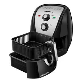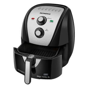 Fritadeira sem óleo com 8 litros de capacidade. Tecnologia de circulação de ar quente. Cesto removível e revestimento antiaderente Duraflon. Controle de temperatura até 200°C, timer de 60 minutos, aviso sonoro e desligamento automático. Potência de 1900W.Porta-fio