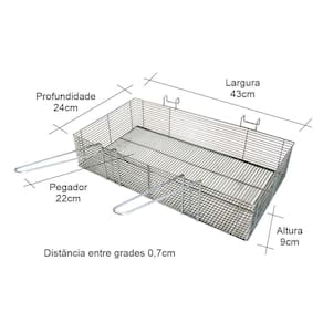 - consumo médio 0,530 kg/h. - potência gás: 6.042 kcal/h - acompanha 1 cesto removível : 43cm x 24cm x 9cm alt. - cabo de manuseio - 22cm - espaço entre as grades/telas: 0,7cm - peso líquido: 5,0 kg - peso bruto: 5,6 kg - medidas totais : 18cm a x 59cm l x 38cm p - medidas embalagem: 28cm a x 60cm l x 51cm p