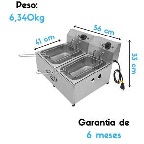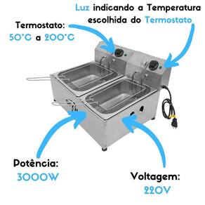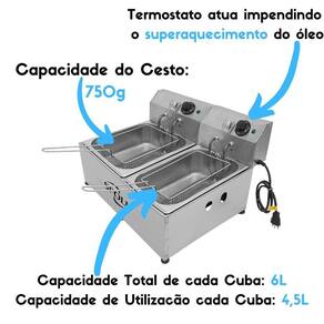 A fritadeira elétrica spolu foi desenvolvida para frituras com alta qualidade em bares, restaurantes, eventos, hotéis e até mesmo residências. Possui cuba com capacidade total de 6l cada cuba e capacidade indicada para 4,5l de óleo cada cuba. Seu tanque é confeccionado em aço inoxidável, que oferece fácil limpeza. Possui cesto em aço carbono cromado, seu termostato atua impendindo o superaquecimento do óleo e acompanha luz que indica quando o óleo atingiu a temperatura escolhida no termostato. A fritadeira elétrica é ideal para qualquer tipo de fritura, principalmente porções, congelados, pastéis e etc. Produtos spolu - conceito de qualidade. Dados do produto: Marca: spolu Modelo:fritadeira elétrica - 2 cubas 220v e 110v Cor predominante:preto/prata Material predominante :inox e aço carbono Dimensões do produto sem embalagem: Altura: 330mm Largura: 560mm Comprimento: 40,5mm Peso: 6,34kg Potência: 3000w Termostato:50ºc a 200c Alimentação: 110v ou 220v Capacidade total:6l cada cuba - total 12l Capacidade de utilização:4,5 l cada cuba - total 9l - indicado pelo fabricante : 6 meses Itens inclusos na embalagem:fritadeira elétrica, cesto cromado, manual de instruções. Marca: Não Informado
