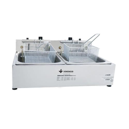 Modelo SFE212Prepara Salgados e frituras em geral.Cuba para óleo estampada em aço inox no modelo Gastronorm de 1 /2Termostato regulador temperatura 80 a 180 CAcompanha um termostato interno de segurança que serve de limitador de temperatura.Medida de cada cuba: 10cm A x 26,5cm L x 32,5cm PCapacidade mínima óleo por cuba 3LtsCapacidade máxima óleo por cuba 4,8Lts.Consumo Total Médio 2 x 2,0 Kwh/mês.Potência Watts:2 x 2000 WattsAcompanha 2 Cesto Removível 24cm x 18cm x 9cm Alt.Peso Líquido 5,3 KgPeso Bruto 5,8 KgMedidas totais : 18cm A x 56cm L x 35cm PMedidas com a embalagem: 27cm A x 52cm L x 59cm P
