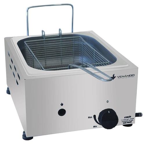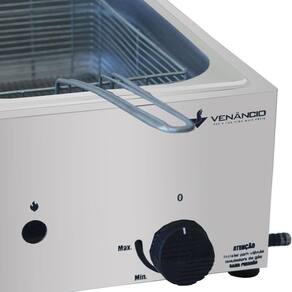 DETALHES DFRITADOR SIMPLES VENÂNCIO 5 LITROS - Cuba para óleo estampada em aço inox no modelo Gastronorme de 1/2; - Gás GLP baixa pressão; - Corpo externo em aço inox 430; - Acompanha um cesto; - Manipulador com regulagem de 3 posições;