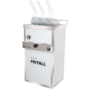 DETALHES - Fritador a gás de alta pressão; - Gás GLP (GÁS DE BOTIJÃO) - Queimador com sistema de gaveta, facilitando o acendimento; - Acabamento esmaltado a fogo, sendo interno com Easy Clean (esmalte de fácil limpeza) e externo esmaltado a fogo na cor branca; - Pés com regulagem de altura; - Cantoneiras e escorregador de óleo em aço inox 430; - Acompanham 3 cestos; - Garantia 3 meses legal mais 3 meses pela fábrica.