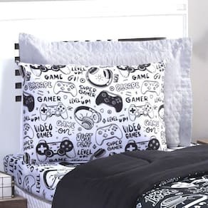 Fronha Avulsa Micropercal 200 fios Dupla Face Preto e Branco Game 65 cm x 45 cm A belíssima fronha GAME é ideal para a cama de seu filho a . Ela deixa seu quarto o confortável e personalizado e ainda é dupla face um lado estampada em branco e o outro em preto tendo dois produtos em um