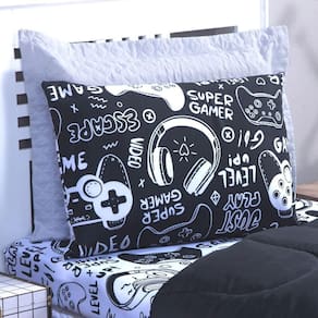 A belíssima fronha GAME é ideal para a cama de seu filho a . Ela deixa seu quarto o confortável e personalizado e ainda é dupla face um lado estampada em branco e o outro em preto tendo dois produtos em um