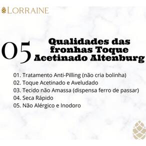 - Confeccionada em tecido 100% poliéster de última geração com toque aveludado e leve brilho acetinado, a coleção Toque Acetinado possui ação Anti-Pilling, que impede a formação de bolinhas, evitando o desgaste do tecido durante o uso e as lavagens, conservando o aspecto de novo por muito mais tempo.