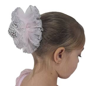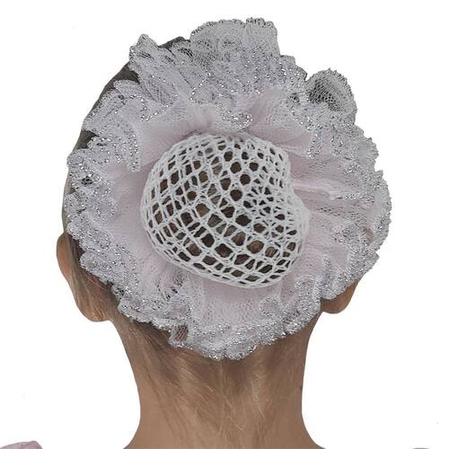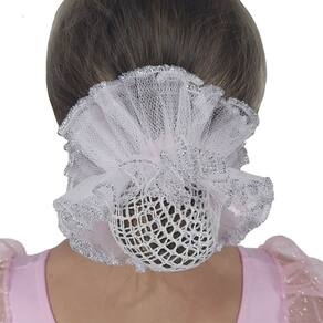 Confeccionado em tule com a borda em fio brilhoso para dar acabamento, o arranjo se encaixa ao redor do coque da bailarina, se ajustando perfeitamente.