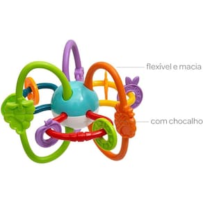 Possui som de chocalho, além de design leve e divertido, com tamanho ideal para as mãozinhas pequenas agarrarem com facilidade.