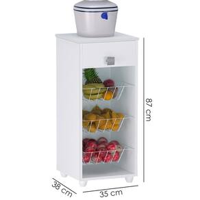 Fruteira Monalisa, funcional e compacta, ideal para o dia a dia. Estrutura em MDP (12/15 mm - fundo 3 mm) com acabamento em pintura UV. Possui gaveta superior com corrediças metálicas, cestos metálicos espaçosos para armazenar frutas e puxadores e pés plásticos. Entregue em 1 volume.