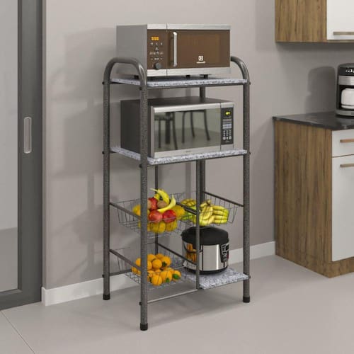 A fruteira Lavinea Plus chegou para completar sua cozinha, fruteira e Base Para Microondas foi feita para você que procura utilidade e beleza com ótimo espaço e acabamento em um único produto. Conta com pintura eletrostática a pó na cor prata martelado, contém sapatas plásticas nos pés para evitar arranhões no piso e seu tampo é em pedra de granito. Prática irá manter sua cozinha organizada e suas frutas e legumes bem guardados, ela vai proporcionar para o seu ambiente, um visual moderno e sofisticado, deixando o local muito mais agradável e convidativo, além de economizar seu tempo na organização. Aproveite!! Acabamento: Pintura Acabamento da Gaveta: Acabamento da Porta: Acabamento da Prateleira: Verniz Acabamento dos Pés: Altura dos Pés: Ambiente Principal: Cozinha Cesto para Frutas: 03 Cesto Removível: Sim Complexidade da Montagem: Baixa: pode ser montado por uma pessoa sozinha Cor: Martelado Prata/Granito Ocre Cor do Produto: Martelado Prata/Granito Ocre Cor Flex: Cor Interna: Escala de Brilho: Semi-Brilho Escala de Brilho da Gaveta: Escala de Brilho da Porta: Escala de Brilho da Prateleira: Semi-Brilho Gaveta com Chave: Informações Complementares: Itens Inclusos: 1 Fruteira, Kit Ferragens e Manual de Montagem Linha ou Coleção: Manual de Especificação Técnica: Manual de Montagem e Instalação: https://cdn2.madeiramadeira.com.br/atributo/soma-moveis-ltda/1133993-manual-de-montagem-fruteira-lavinea-plus-rev-0-0-1.pdf Material da Gaveta: Material da Porta: Material da Prateleira: Granito Material do Cesto: Aço Material do Puxador da Gaveta: Material do Puxador da Porta: Material dos Pés: Aço Montagem Flex: Necessita Montagem: Sim Origem do Produto: Nacional Pés Reguláveis: Não Peso: 35.4 Peso Máximo por Gaveta: Peso Máximo por Prateleira: 8 Possui Pés: 04 Possui Portas: Não Recomendações de Uso, Manutenção e Limpeza: Limpar com flanela ou pano Pano levemente umedecido e pano seco. Não utilizar produtos abrasivos. Não expor o produto diretamente à luz solar e à umidade. Rodízio com Trava: Sapatas Niveladoras: Não Sistema de Montagem: Parafusos, Tampa Parafusos e Sapatas Plásticas Suporta Até (kg): 30 Tipo de Corrediça da Gaveta: Tipo de Dobradiça/Corrediça da Porta: Tipo de Madeira Maciça: Tipo de Madeira Maciça da Gaveta: Tipo de Madeira Maciça da Porta: Tipo de Madeira Maciça da Prateleira: Tipo de Madeira Maciça do Puxador da Gaveta: Tipo de Madeira Maciça do Puxador da Porta: Tipo de Madeira Maciça dos Pés: Tipo de Porta: Tipo de Puxador da Gaveta: Tipo de Puxador da Porta: