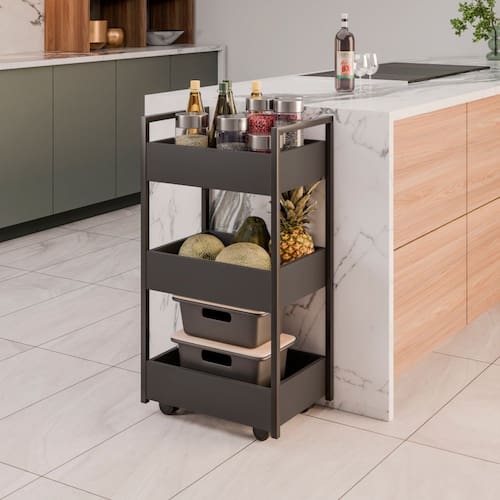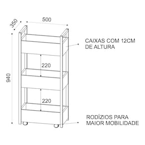 Características: Estrutura em aço carbono com pintura TX texturizada; Acabamento em melamina BP; Cestos em MDP 15mm; Possui 3 cestos espaçosos; Possui 4 rodízios que permitem fácil movimentação;