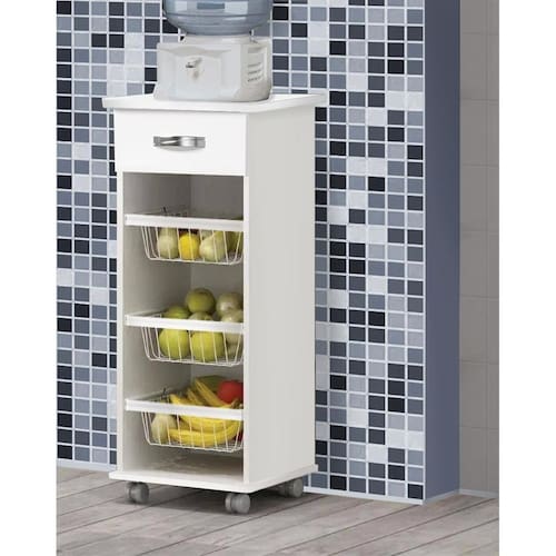 Fruteira pop com gaveta com 3 cestos reforçados - tampo arredondado com perfil plástico- 97 cm de altura- 33 cm de profundidade- 41 cm de largura.- chapas mdp 15mm de espessura- corrediças plásticas nos cestos- cestos epóxi não enferrujam - cestos com puxadoresMóvel em alta qualidade de acabamento, sua pintura, é em acabamento brilhante seu tampo é arredondado e com perfil plástico, trazendo mais segurança a eventuais impactos, todas as chapas são de 15mm de espessura, gerando maior resistência e qualidade ao produto. O adicional da gaveta torna a peça indispensável na sua casa, compacta e prática.Seus cestos são de aço com pintura epóxi não enferrujam possuem alta qualidade de acabamento e resistência, possuem puxadores envernizados na cor branca, tornando seu manuseio muito fácilO mesmo possui corrediças plásticas para acomodar e deixar o manuseio dos cestos muito mais prático. Lembre-se nosso móvel vem desmontado, porém, na sua embalagem há um manual de montagem bem simples, o mesmo pode ser oferecido digitalmente, caso seja sua preferência.