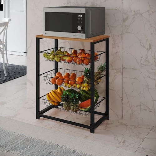 Fruteira Com Suporte Para Micro-Ondas Barcelona Aço Preto Cesto Preto Tampo CanelaA Fruteira Suporte de Micro-ondas Barcelona possui 3 cestos estilo gaveta, para o armazenamento de frutas e legumes e ainda possui tampo de MDF na parte superior, livre para colocar objetos de decoração, utensílios e ela é ideal para colocar seu micro-ondas. A Fruteira fica linda em qualquer tipo de cozinha. Facilitando na organização e na praticidade do dia a dia.Tipo: Fruteira Suporte para Micro-ondas Modelo: BarcelonaCor Base: Preto Cor Cesto: Preto Cor Tampo: Canela Quantidade de Volumes: 3A Fruteira vai desmontada e acompanha manual para montagem.Medidas:Altura: 83,5cmLargura: 63cmComprimento: 35cmATENÇÃOIMAGENS MERAMENTE ILUSTRATIVAS REALIZADO EDIÇÃO, PODENDO HAVER UMA PEQUENA VARIAÇÃO DE COR DEPENDENDO DE CADA TELA OU MONITOR.Fruteira com Suporte para Micro-ondas Barcelona AÃo Preto Cesto Preto Tampo Canela