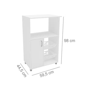 Características: Estrutura MDP Pintura UV Fosco 01 Porta com dobradiças metálicas 02 Cestos para frutas Puxadores de Plástico Peso suportado no Tampo: 20kg Peso suportado no Cesto: 2,5kg