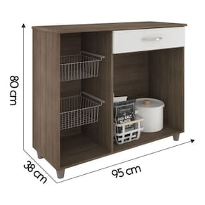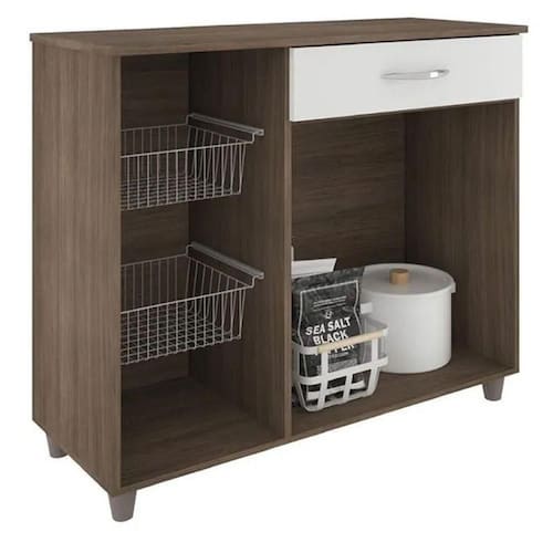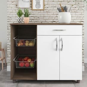 Ideal para abrilhantar a sua cozinha, e proporcionar organização. A Fruteira Amanda - Móveis Fiorello, te ajuda em sua rotina, com duas portas e uma gaveta traz a possibilidade de guardar seus mantimentos de forma organizada. Além de três cestas aramadas, que exercem a função de fruteira.