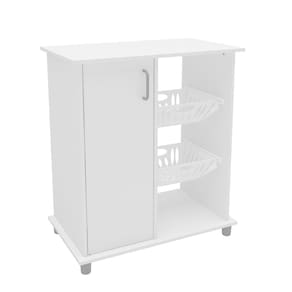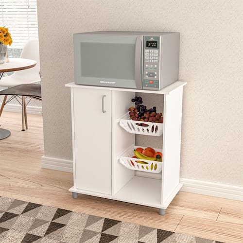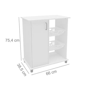 Características: Estrutura MDP Pintura UV Fosco Puxadores de Plástico 01 Porta com dobradiças metálicas 02 Cestos para frutas Peso suportado no Tampo: 20kg Peso suportado na Prateleira: 5kg Peso suportado na Cesta: 3kg