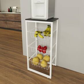 Fruteira De Chão Branco Brilho Em Aço Preto Fruteira multiuso com cestos deslizantes produzida em aço, podendo ser utilizada em vários ambientes na cozinha, banheiro, quarto, facilitando seu dia-a-dia. Seu tampo superfície superior em MDF permite sua utilização para diversas outras possibilidades, como a utilização de arranjos ou até mesmo utensílios domésticos, como BEBEDOURO, suportando até 30 kg, o que lhe propicia um excelente custo-benefício. Dimensões: Altura - 80cm Largura - 39,5cm Profundidade - 23cm Beneficios: Cestos Deslizante, de fácil encaixe. Produto resistente. Com sistema de regulagem de altura. Pintura eletróstatica Epóxi, maior durabilidade não enferruja Conteúdo da Embalagem: 1- Fruteira 3 cesto de fábrica. 3 meses contra defeito de fabricacão. Marca: Não Informado