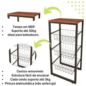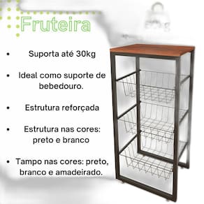 Fruteira de chão em aço cozinha suporte bebedouro mdf preto Produto vai desmontado, necessita realizar a montagem O produto já é enviado com o kit para instalação. Fruteira multiuso com cestos deslizantes produzida em aço, podendo ser utilizada em vários ambientes na cozinha, banheiro, quarto, facilitando seu dia-a-dia. seu tampo superfície superior em mdf permite sua utilização para diversas outras possibilidades, como a utilização de arranjos ou até mesmo utensílios domésticos, como bebedouro, suportando até 30 kg, o que lhe propicia um excelente custo-benefício. Dimensões: Altura - 77cm Largura - 40cm Profundidade - 30cm Benefícios: Cestos deslizante, de fácil encaixe. Produto resistente. Com sistema de regulagem de altura. Pintura eletrostática epóxi, maior durabilidade não enferruja Conteúdo da embalagem: 1- fruteira preta com mdf preto de 3 cesto de fábrica. 3 meses contra defeito de fabricação. Marca: Não Informado
