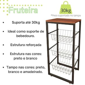 Fruteira De Chão Para Cozinha Branco Brilho Aço Amadeirado Fruteira multiuso com cestos deslizantes produzida em aço, podendo ser utilizada em vários ambientes na cozinha, banheiro, quarto, facilitando seu dia-a-dia. Seu tampo superfície superior em MDF permite sua utilização para diversas outras possibilidades, como a utilização de arranjos ou até mesmo utensílios domésticos, como BEBEDOURO, suportando até 30 kg, o que lhe propicia um excelente custo-benefício. Dimensões:Altura - 80cmLargura - 39,5cmProfundidade - 23cm Beneficios:Cestos Deslizante, de fácil encaixe.Produto resistente. Com sistema de regulagem de altura.Pintura eletróstatica Epóxi, maior durabilidade não enferruja Conteúdo da Embalagem:1- Fruteira 3 cesto Garantia de fábrica. 3 meses contra defeito de fabricacão. Marca: Belolar