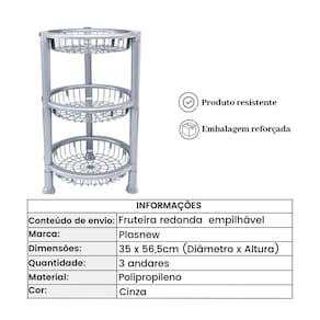 Você vai poder guardar frutas de forma segura e elegante com a Fruteira de plástico com 3 andares redonda empilhável Cinza.As cestas são de encaixe fixo e permite que você movimente, monte e desmonte com muita facilidade, além de permitir uma higienização com mais facilidade.Informações importantes;Medidas aproximadas montada - 35 x 56,5cm Diâmetro x Altura Composição - PolipropilenoCor - CinzaValidade - IndeterminadaFabricante - PlasnewProduto 100% NacionalMais Informações;Antes da primeira utilização, lave com água quente e detergente.Nunca utilize palha de aço, pois causa riscos e prejudica o produto.Após a limpeza, enxugue imediatamente para evitar formação de manchas. Fruteira de plástico com 3 andares redonda empilhável Cinza