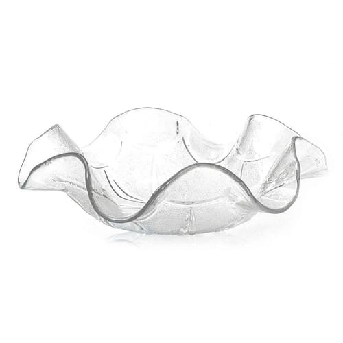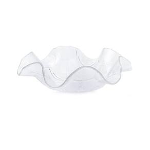 Fruteira de Mesa, ideal para servir frutas, ou até mesmo outros tipos de alimentos, como por exemplo, sobremesas, mousses, etc. A peça é redonda, trabalhada em vidro, ondulada, com desing de folha.