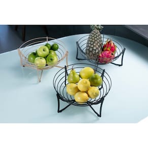 Perfeita combinação do arame com a chapa, Peça com design ideal para ser colocada sobre a bancada ou centro de mesa, a transparência obtida em função dos espaços vazios entre arames e chapas permite que as frutas sejam as protagonistas, trazendo seu colorido e vitalidade ao seu espaço. Acabamento em Aço Carbono, disponível em 3 cores: PRETA, CINZA e GOLD MATTE Tamanho: L345mm x A155mm Cuidados para limpeza: utilize um pano umedecido e sabão neutro para a limpeza. Seque com um pano limpo. Nunca aplique produtos abrasivos, pois eles removem a camada protetora do metal. Em regiões com maresia ou ambientes agressivos, faça a limpeza semanalmente. Aplique cera automotiva líquida ou silicone sobre