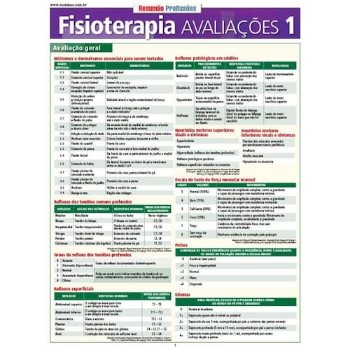 As informações são organizadas em tabelas de consulta rápida e eficiente. Na avaliação geral, por exemplo, informações sobre miótomos e dermátomos essenciais, reflexos superficiais, reflexos patológicos, escala do teste de força muscular manual, pulsos e edemas entre outros. E ainda: avaliações dos sistemas musculoesquelético e neuromuscular. O Resumão Fisioterapia Avaliações 2 traz as informações que completam o Avaliações 1, com os sistemas pulmonar e cardiovascular, além do tegumentar.