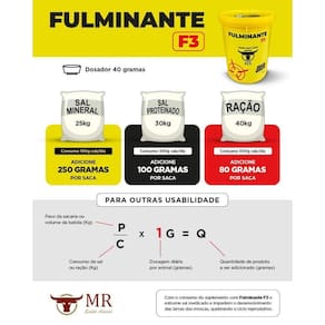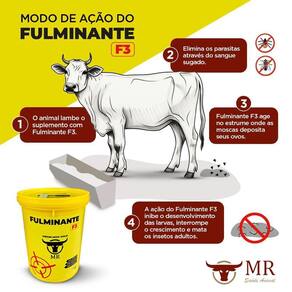 O modo de uso é simples e prático. Basta adicionar o produto ao sal mineral, proteinado ou ração dos animais. Para bovinos, recomenda-se misturar o Fulminante F3 na proporção de 1 grama por dia consumido pelo animal. No caso do sal mineral, a mistura é de 250 gramas do produto por saca de 25 kg, enquanto no sal proteinado é de 100 gramas por saca de 30 kg.