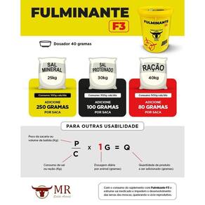O modo de uso é simples e prático. Basta adicionar o produto ao sal mineral, proteinado ou ração dos animais. Para bovinos, recomenda-se misturar o Fulminante F3 na proporção de 1 grama por dia consumido pelo animal. No caso do sal mineral, a mistura é de 250 gramas do produto por saca de 25 kg, enquanto no sal proteinado é de 100 gramas por saca de 30 kg.