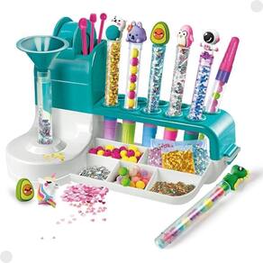 Conteúdo da Embalagem: 1x estação de trabalho de plástico, 10x corpos de caneta, tampas, plugues e pontas, 12x recargas de tinta, glitter em pó, 6x sacos de decorações, 40x mini pompons, 32x contas de plástico, 10x caracteres de borracha, 1x manual ilustrado, 1x funil e instrumentos