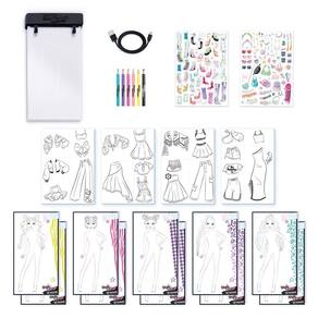 O que está incluído no kit? O kit inclui 1 prancheta luminosa com cabo USB, 10 modelos para desenhar, 4 folhas de moldes de roupas, 2 folhas de adesivos fashion, 6 lápis de cor e 1 guia de instruções.