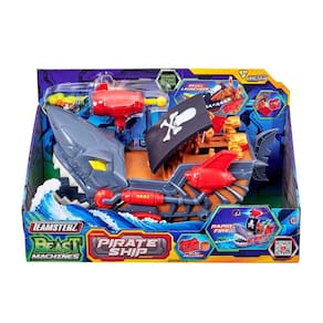 Contém: 1 navio pirata, 1 carrinho, 1 canhão, 1 bala de canhão, 1 baú porta carrinho e 1 barril.