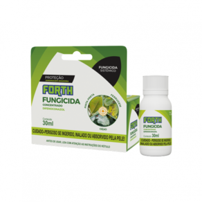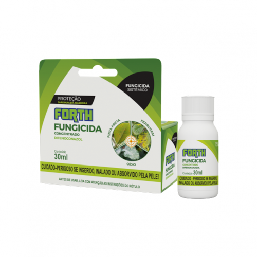 Fungicida Forth Concentrado 30ml É sistêmico a base de Difenoconazol eficaz contra manchas foliares, ferrugem, pinta preta e oídio. Validade: 2 anos da data de fabricação do produto.MODO DE USO - Concentrado 30ml Diluir 30ml em 1 litro de água e pulverizaras plantas na dose de 100ml/m², evitando os horários mais quentes do dia. Usar imediatamente após a sua preparação. Repita a aplicação a cada 7 dias ou quando necessário. É esperada a eficácia do produto após 48 horas. COMPOSIÇÃO - ConcentradoDifenoconazole...........................................................0,57% (p/p)Aditivo, atenuador de espuma, conservante, tensoativonão iônico, umectante, espessante e veículo.................99,43% (p/p)Registro MS Nº: 3.6882.0021.001-5