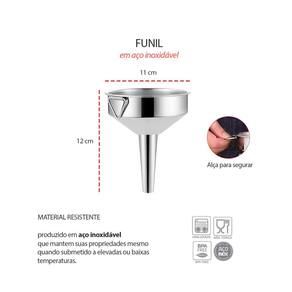 Funil em aço inox. Perfeito para drinks, doces, molhos e chas. Produzido todo em aço inoxidavel é duravel e pratico para limpar, indicado para uso na maquina de lavar louças. Funil perfeito para cozinha residencial ou industrial. Contem: 1 Funil Medidas: 12 x 11 cm Material: Aço Inoxidavel