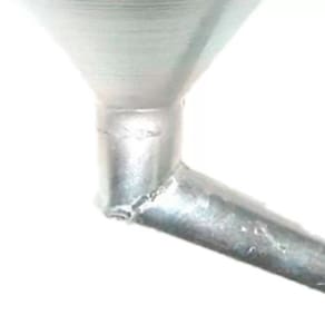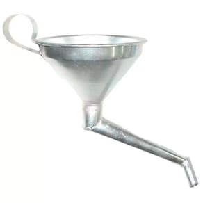 Funil produzido com chapa de aço carbono, com alça soldada a ponto sem rebarba e tratamento de galvanoplastia, que é o banho estético que ajuda prevenir pequenas oxidações no funil para óleo lubrificante.