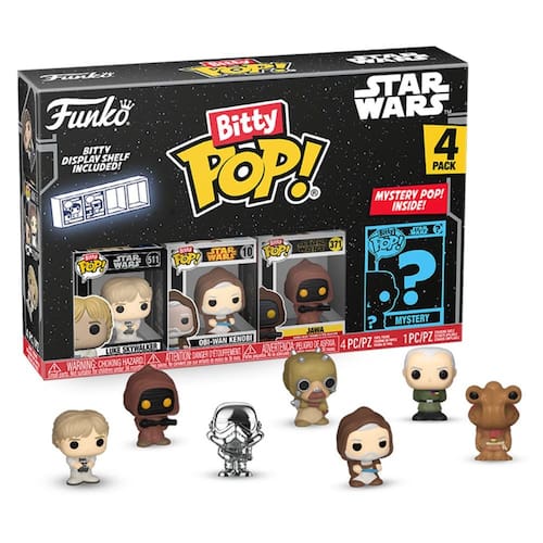-Modelo: Funko Bitty Pop Star Wars Luke 4 pack -Marca: Funko -Peso: 100g -Material: Vinil -Altura: 2,5 cm -Quantidade: 4 Unidade (1 modelo surpresa)