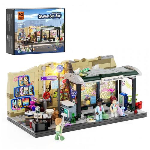 As peças impressas incluem murais de grafite em grande formato e ilustrações de animais estilizados, criando um painel visual de destaque no fundo do cenário. O conjunto traz minifiguras com visual de rua, como artista de grafite, usuária de skate, trabalhadora e passageira, permitindo montar diferentes interações no ponto de ônibus.?