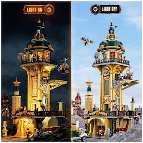O sistema de iluminação utiliza dezenove pontos de LED distribuídos em lustre de entrada, área de reator com efeito de chamas vermelhas, sinais em azul e vermelho, iluminação do telescópio e baliza superior com efeito de luz pulsante azul. O conjunto acompanha seis minifiguras temáticas que representam personagens da torre e da cidade steampunk, ampliando as possibilidades de narrativa.