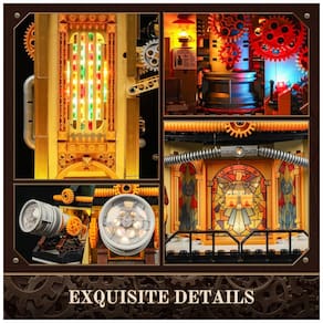 O modelo integra múltiplos mecanismos móveis, incluindo elevador em sistema de paralelogramo, conjuntos de engrenagens rotativas e componentes articulados ligados ao telescópio. Esses recursos permitem simular movimentos de observação e operação de maquinário, reforçando o caráter de torre experimental em universo retrofuturista.