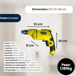 Especificações:Impacto: 600WMotor: 300WRotação em Vazio (rpm): 0-3000/minCapacidade do Mandril: 3/8'' - 10mmCapacidade de Furação: Aço: 10mm (3/8''), Madeira: 20mm (3/4''), Concreto: 10mm (3/8'')Isolação: DuplaFrequência: 50Hz/60HzTorque: 10NmTipo do Mandril: Aperto RápidoComposição: Aço, Plástico, Ferro e BorrachaDimensões: 23??8??26?cmCor: AmarelaPeso: 1,190kgAmpares: (10A)Conteúdo: