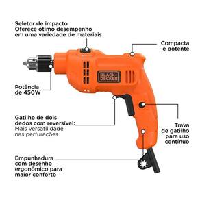 Potente motor de 450W, ideal para perfuracoes em madeira, metal e alvenaria. Seletor de Impacto - Oferece otimo desempenho em uma variedade de materiais. Trava de gatilho, garantindo mais praticidade em usos continuos. Ergonomica, moderna e compacta, a Furadeira de Impacto Black+Decker BED710450 e versatil e ideal para uma ampla variedade de aplicacoes. Com potencia de 450W e velocidade de ate 3000 rpm, oferece desempenho confiavel em diferentes tipos de superficies.